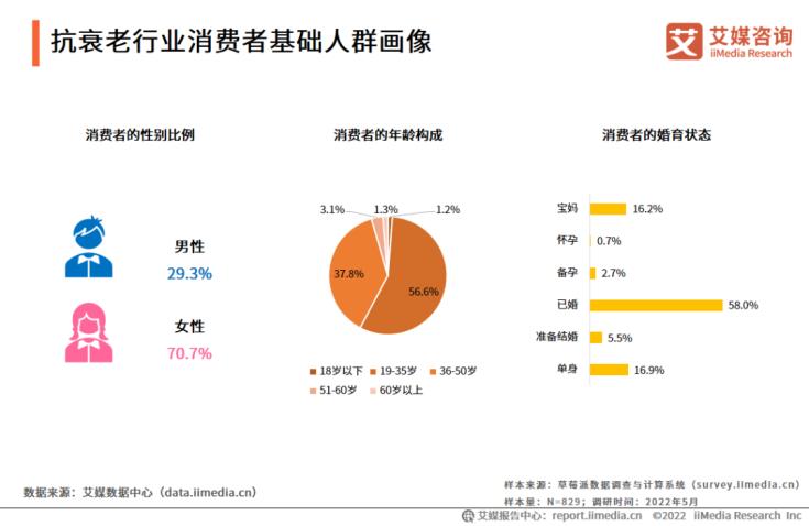 iiMedia Research(艾媒咨詢)數據顯示,購買抗衰老產品的消費者中女性占70.7%,男性占29.3%,56.6%的消費者年齡為19-35歲,37.8%消費者年齡為36-50歲。其中,58.0%的受訪消費者已婚,16.9%處于單身狀態。艾媒咨詢分析師認為,隨著人們的抗衰老意識逐漸深化,延緩衰老的需求日益增長,且消費抗衰老產品的大部分為女性群體,抗衰老行業面向女性消費者存在廣闊的發展空間。
