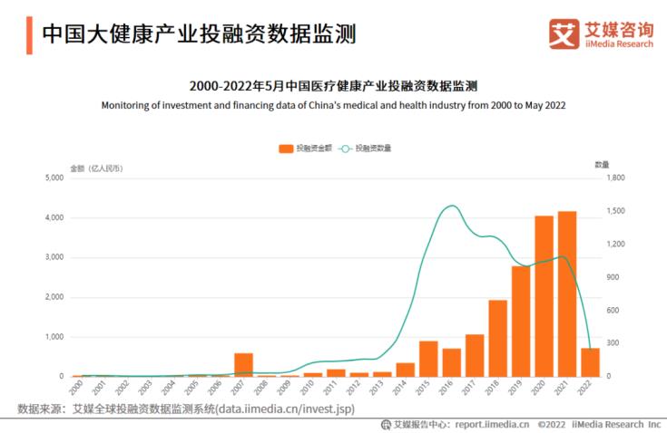 iiMedia Research(艾媒咨詢)數據顯示,中國醫療健康產業投融資金額最多集中在2021年,全年達到4169.44億元。艾媒咨詢分析師認為,受新冠疫情影響,2020年中國大健康產業市場需求大幅上升;隨著疫情形勢好轉,資本活躍度有所下降;隨著疫情的好轉,人們對健康的關注將不斷增加,大健康產業吸納資本的潛力較大。