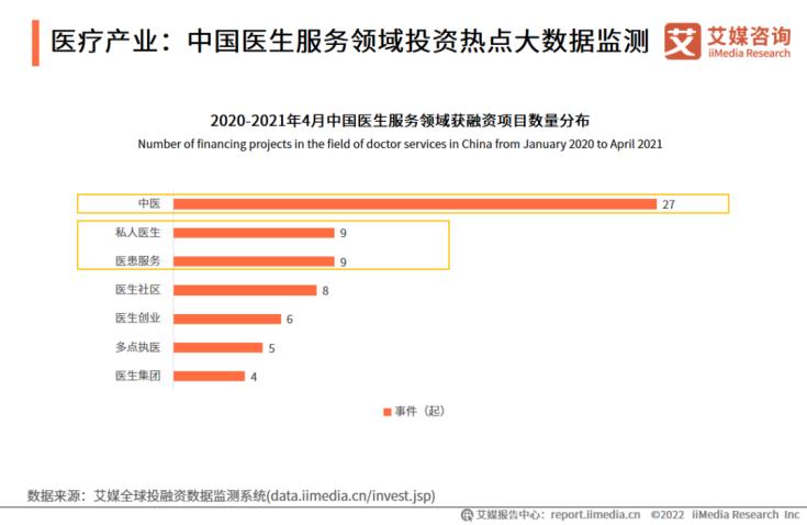 在多元辦醫的主體中,民營醫院是社會資本進入的重要撬動點,而醫生集團以及高端醫療服務是受關注的二級市場。2020-2021年4月中國醫生服務類投資項目數分布中,中醫領域獲得資本關注度最高,有最多項目獲得融資,而私人醫生、醫患服務和醫生社區是值得關注的新的投資增長點。