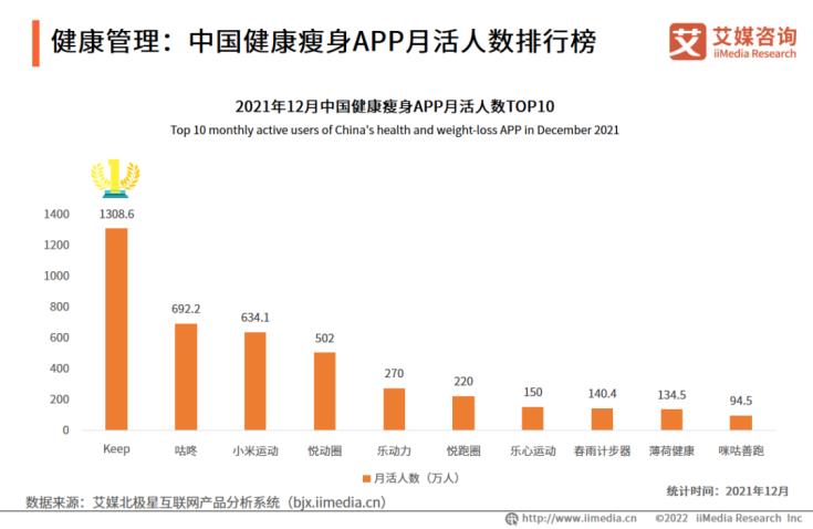 iiMedia Research(艾媒咨詢)數據顯示,2021年12月,中國健康瘦身APP月活人數最高的是Keep,12月月活人數達到1308.6萬人;其次月活人數超過600萬人的APP還有咕咚和小米運動。艾媒咨詢分析師認為,移動互聯網時代下,手機軟件的功能隨著技術水平和人們需求量的上升不斷完善,綜合型健康瘦身APP將受到人們的青睞。