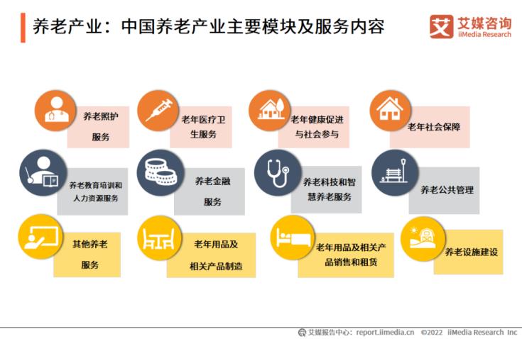 養老產業,是以保障和改善老年人生活、健康、安全以及參與社會發展,實現老有所養、老有所醫、老有所為、老有所學、老有所樂、老有所安等為目的,為社會公眾提供各種養老及相關產品的生產活動集合。養老產業范圍確定為12個大類,反映中國以應對人口老齡化的養老及相關產品供給為基礎,提升養老服務質量,完善大健康產業發展,開拓大健康產業新業態新模式。