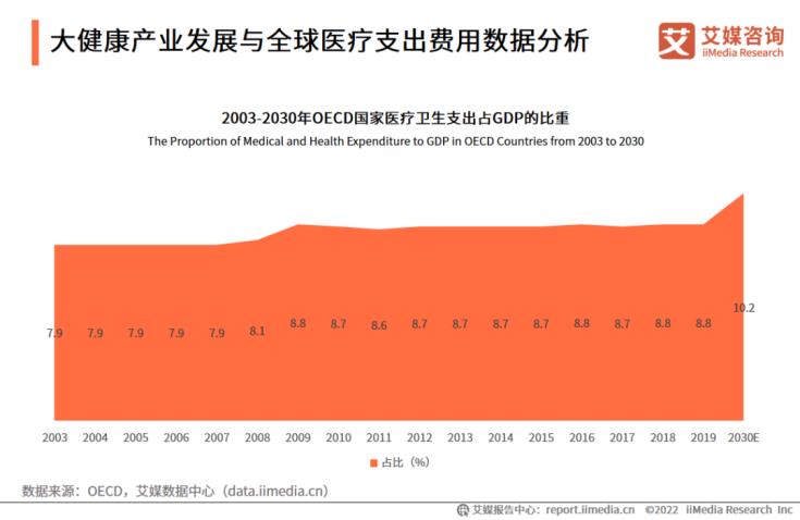 從全世界來看,醫療支出占GDP的比例都是持續上升的。發達國家目前的比重在13%左右,發展中國家約6.0%。艾媒咨詢分析師認為,全球醫療費用支出不斷增加,是受到全球人口老齡化、居民患病比例增加等因素影響,屬于剛性需求;并且,隨著人們對健康標準的不斷提高,大健康產業會在相當長的時期內持續保持增長態勢。