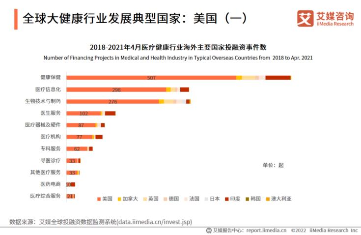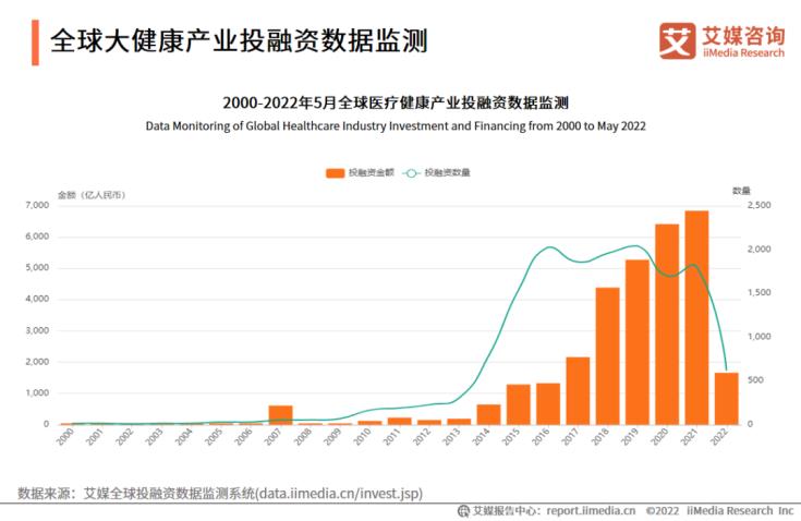 iiMedia Research(艾媒咨詢)數據顯示,全球醫療健康產業投融資金額最多集中在2021年,全年達到6846.03億元,投融資數量最多在2019年,達2044起。艾媒咨詢分析師認為,在新冠疫情的沖擊下,近兩年來全球健康意識不斷增強。隨著人們的健康需求不斷上升,全球大健康產業也得到越來越多資本的關注。