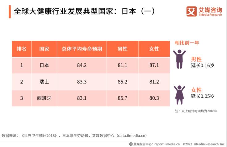 世界衛生組織在日內瓦發布最新報告《世界衛生統計2018》,在各國預期平均壽命排名中,日本蟬聯第一,達到84.2歲,其中女性壽命預期為87.1歲,男性為81.1歲。日本厚生勞動省發布報告,顯示日本女性人均預期壽命2018年相比前一年延長0.05歲,男性延長0.16歲。艾媒咨詢分析師認為,日本作為長壽人口最多的國家,人們對健康的意識較高,對大健康相關產品服務需求量較大,大健康行業在日本有著較廣闊的發展空間。
