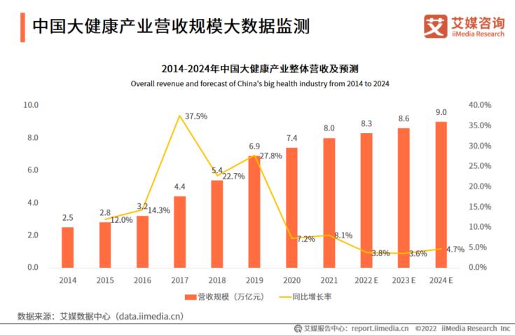 iiMedia Research(艾媒咨詢)數據顯示,2014年到2021年,中國的大健康產業整體營收保持增長,2021年營收規模達8.0萬億元,增幅達8.1%,預計2024年將達9.0萬億元。艾媒咨詢分析師認為,中國與全球的大健康產業發展情況基本一致,同樣由于社會結構變化而需求不斷增長,具有可持續增長性。