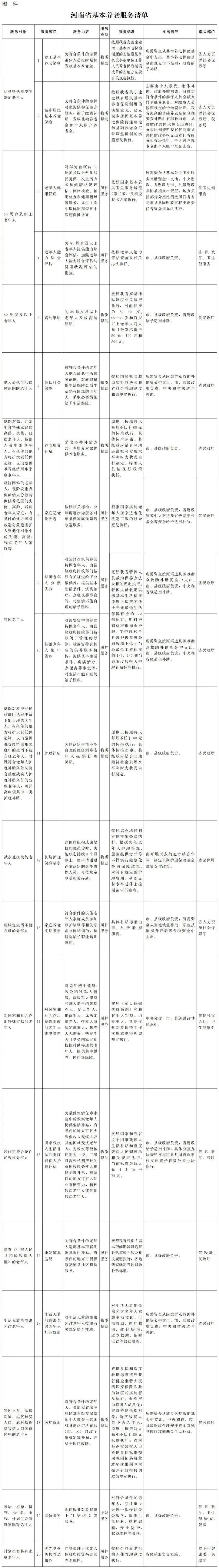 《意見》明確了16條工作任務,包括建立服務響應機制、完善服務保障制度、健全服務設施體系、提升服務供給水平四方面,同時發布了河南省基本養老服務20項清單。