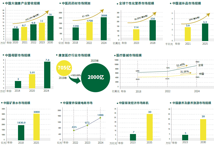 我國(guó)大健康產(chǎn)業(yè)正迎來顛覆性的發(fā)展與機(jī)遇。2023年我國(guó)大健康產(chǎn)業(yè)市場(chǎng)規(guī)模約為11萬億元,預(yù)計(jì)此數(shù)據(jù)到2030年將達(dá)到16萬億元。