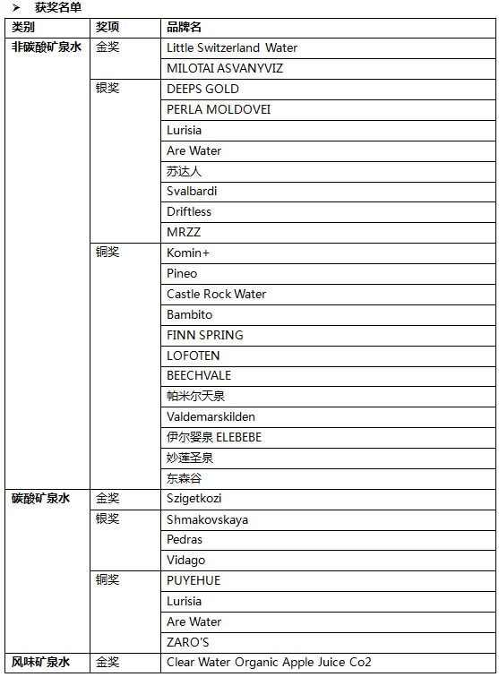 本屆賽事再度與環(huán)球好水協(xié)會強強聯(lián)合,迎來美國、匈牙利、北愛爾蘭、挪威近全球20個國家的優(yōu)質(zhì)水品牌角逐“非碳酸水”、“碳酸水”、“風(fēng)味水”三大獎項。評審團(tuán)由環(huán)球好水協(xié)會會長邁克爾?馬薩博士聯(lián)同韓國、港澳臺四位品鑒專家組成。